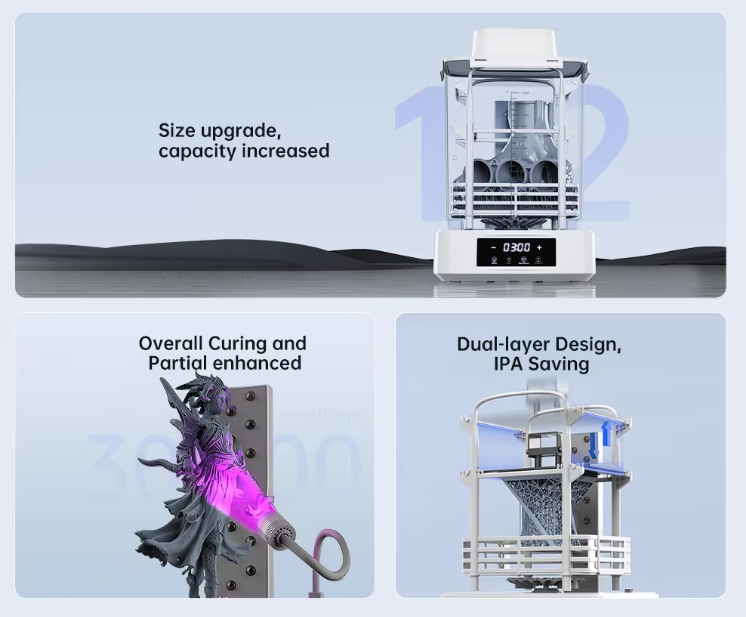 Equipped with a matrix of UV LED lights and a rotating curing platform, the device ensures that your prints receive even, 360° exposure for optimal curing performance. -