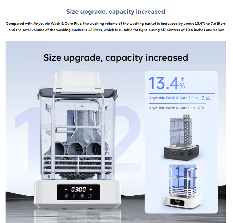 The device features a 3-liter cleaning basket and a total bucket volume of 4 liters, making it suitable for most common resin prints up to 7.3 inches. -